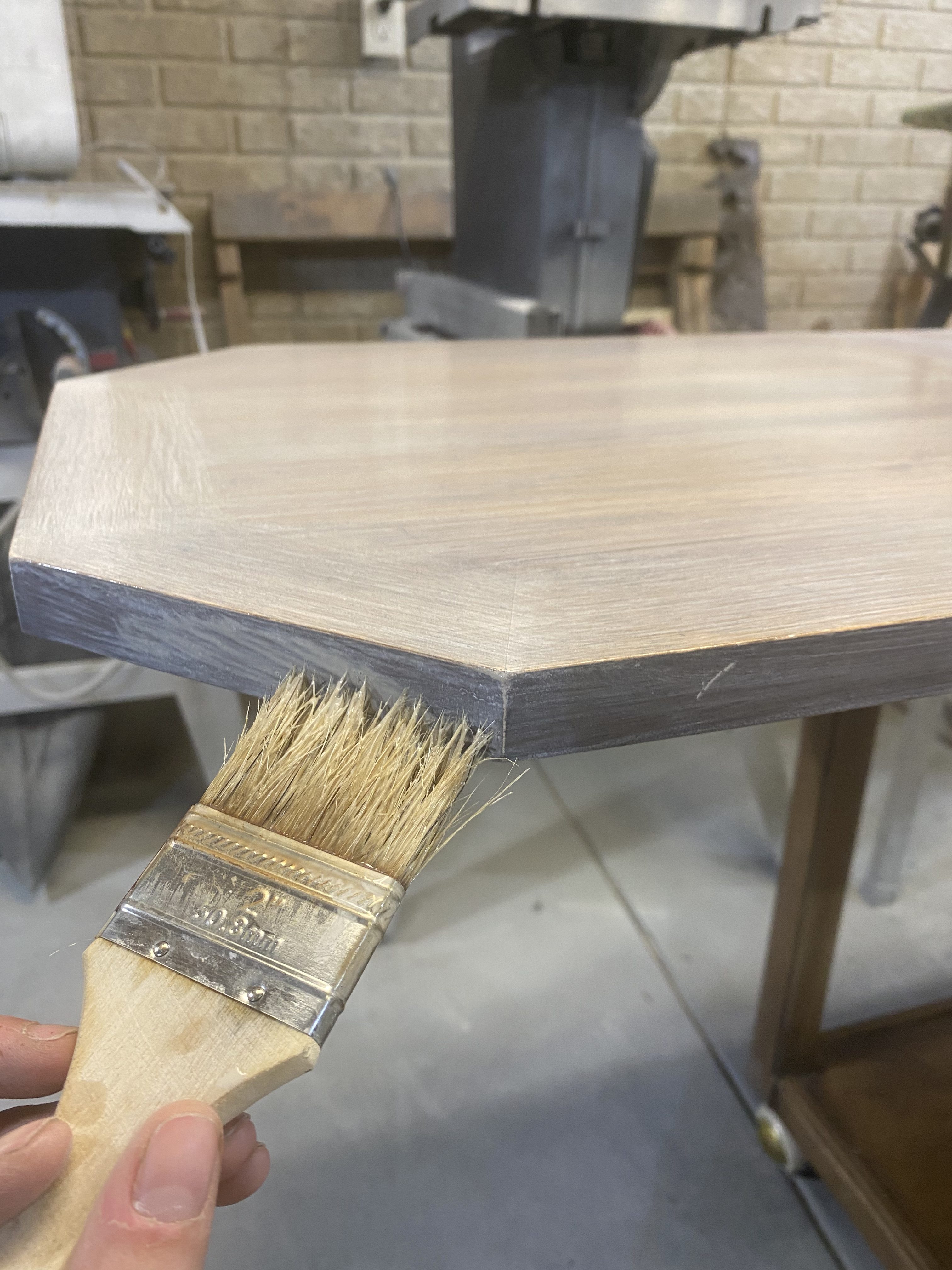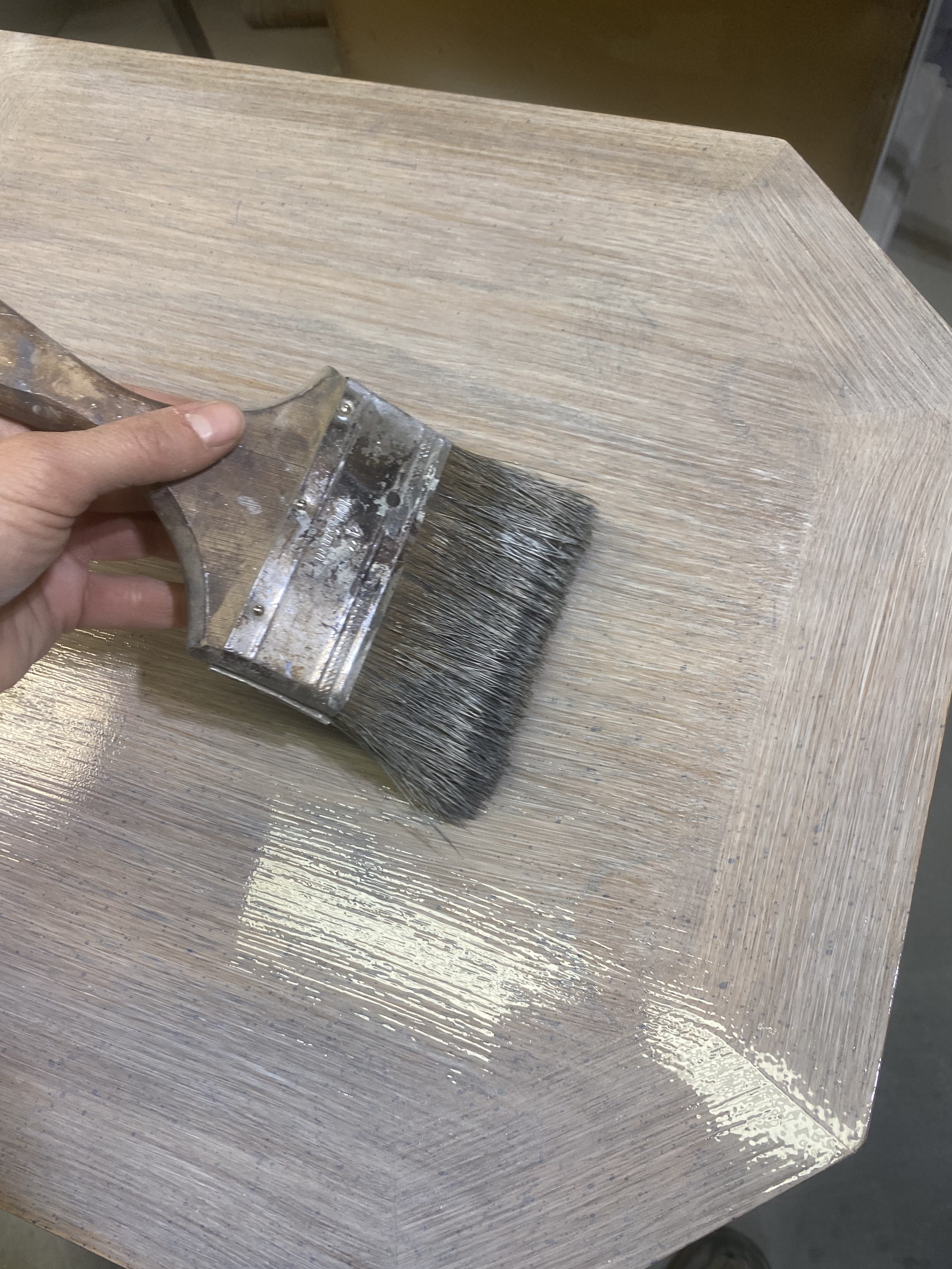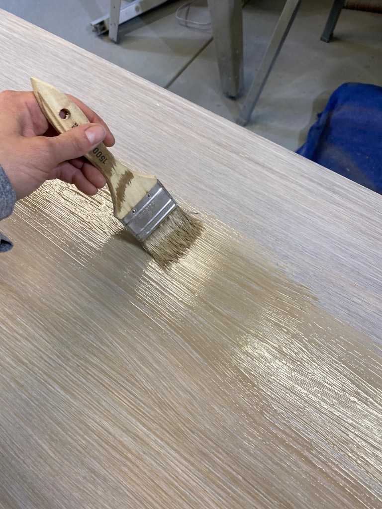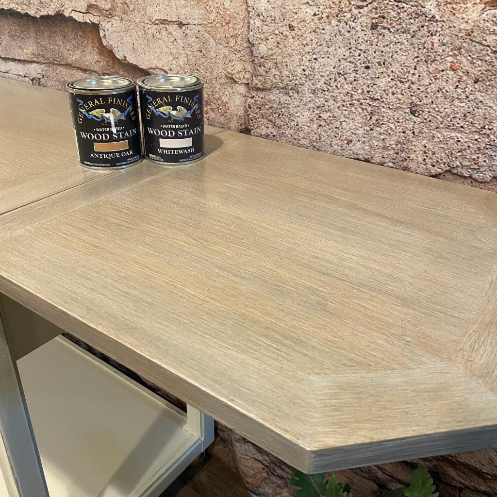 To get more of a raw wood look I want to add a brown tone in. When the white glaze is finished drying I took Antique Oak (General Finishes) and diluted it 5% with water. Glazed over the top of the white to add more of a brown tone to the top. Use the same process as above china chip brush to get on the surface and then smoothed out with a deck brush.