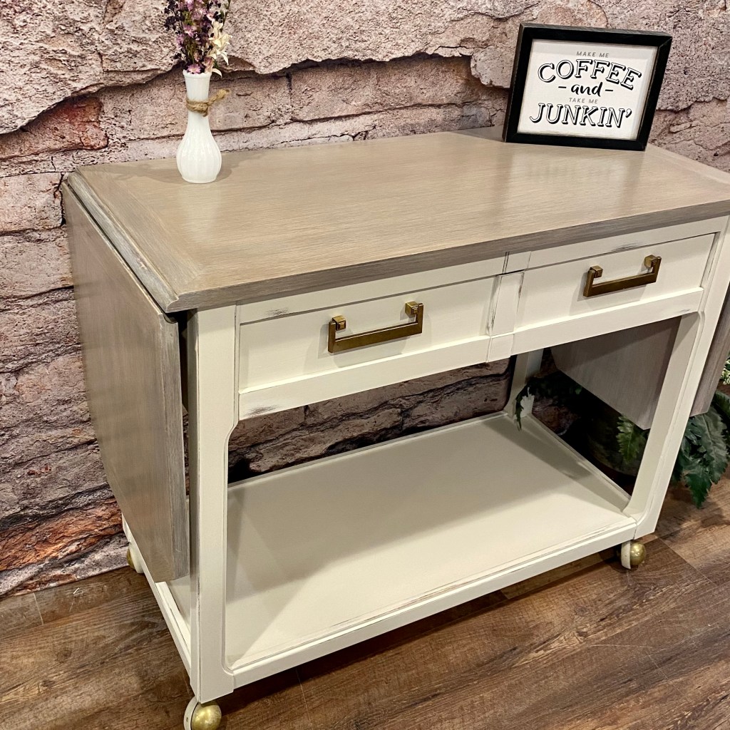 To finish off the raw wood look clear coated Enduro Clear Poly (General Finishes). Then I sprayed my top coat on but it can be brushed on as well. Painted the base of this piece white with light distressing to complete the buffet.